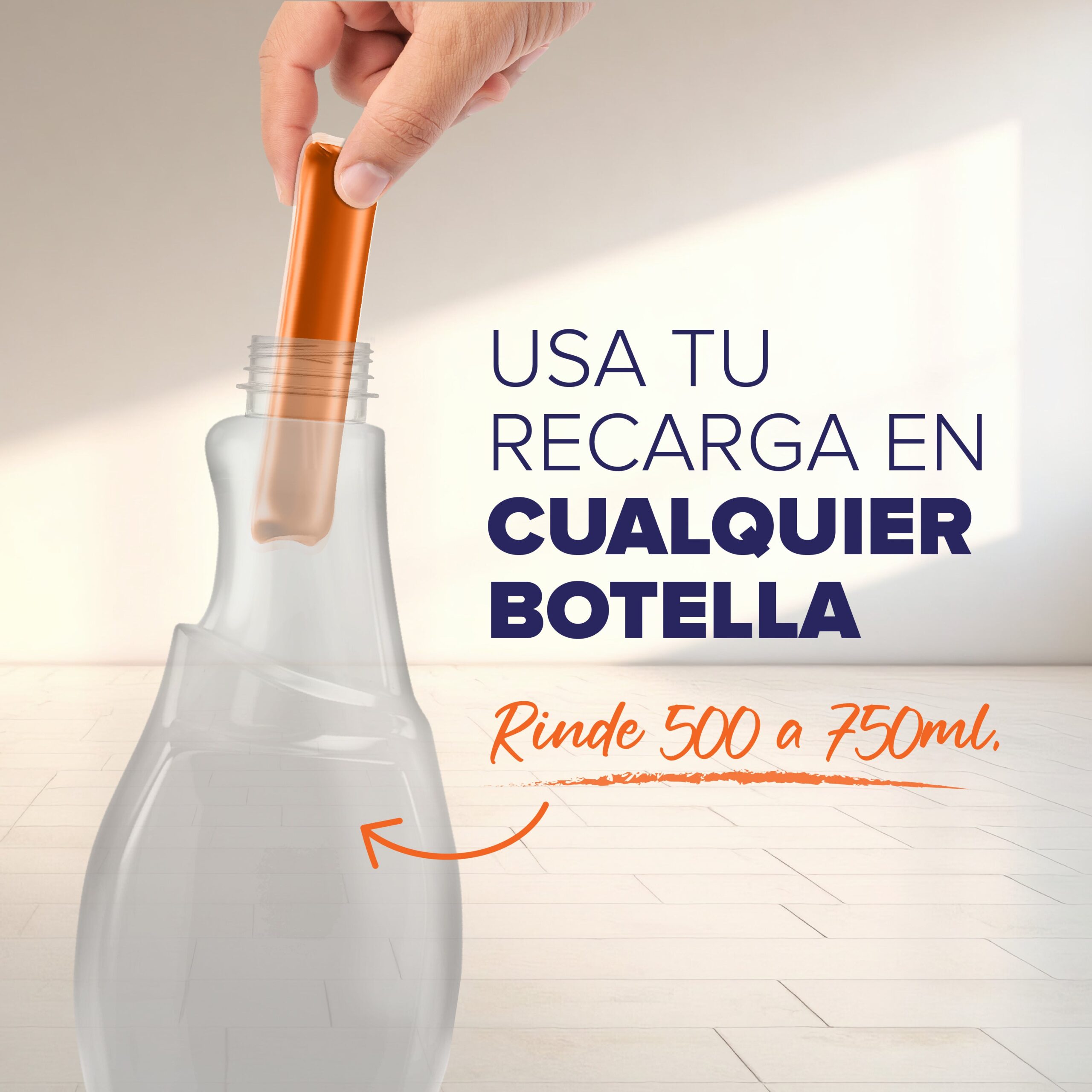 Cada Recarga rinde hasta 750 ml. Introduce la recarga en cualquier botella, llénala con agua, agita.