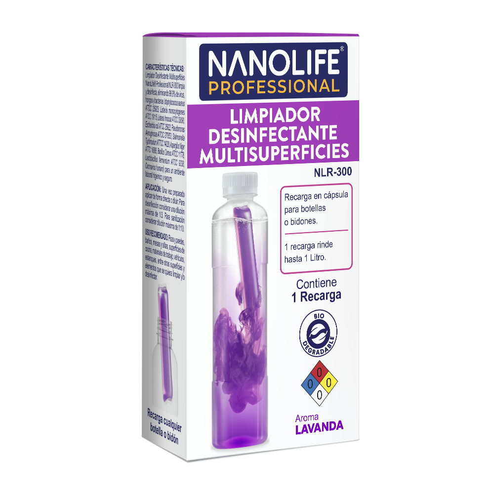 Nuevo Limpiador Desinfectante Multisuperficies NanoLife® Professional NLR-300 remueve la suciedad y desinfecta, eliminando 99,9% de virus, hongos y bacterias.