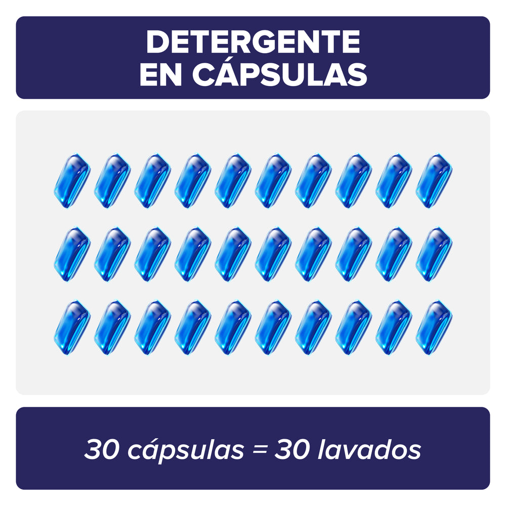 Detergente en cápsulas (30x): 30 cápsulas de nuestra fórmula ultraconcentrada que te permiten lavar hasta 300 kg de ropa (30 lavados de 10 kg). Olvídate de medir tapitas y cargar bidones pesados. En cada cápsula tienes la medida perfecta para un lavado efectivo que dejara tu ropa limpia y aromatizada. Nuestra fórmula biodegradable cuida tu ropa y nuestras playas de los plásticos de un solo uso.